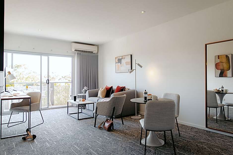 With over 90 square yards, the very spacious Two Bedroom Apartment is perfect for long stays and families and features a large separate living & dining room with a fully-equipped kitchen, balcony, individually controlled heating and cooling, WiFi and more. The main bedroom has a queen bed or two single beds and private bathroom and the second bedroom has two single beds. The second bathroom located off the living area includes laundry facilities. Please provide your bedding preference in the comments. Should you require the apartment to sleep five guests, a fifth person fee will apply.